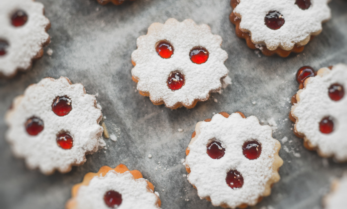 - Die Linzer Augen gut mit Staubzucker bestreuen. Die Keksböden mittig mit Ribiselmarmelade bestreichen und mit den gelochten Keksen zusammensetzen.